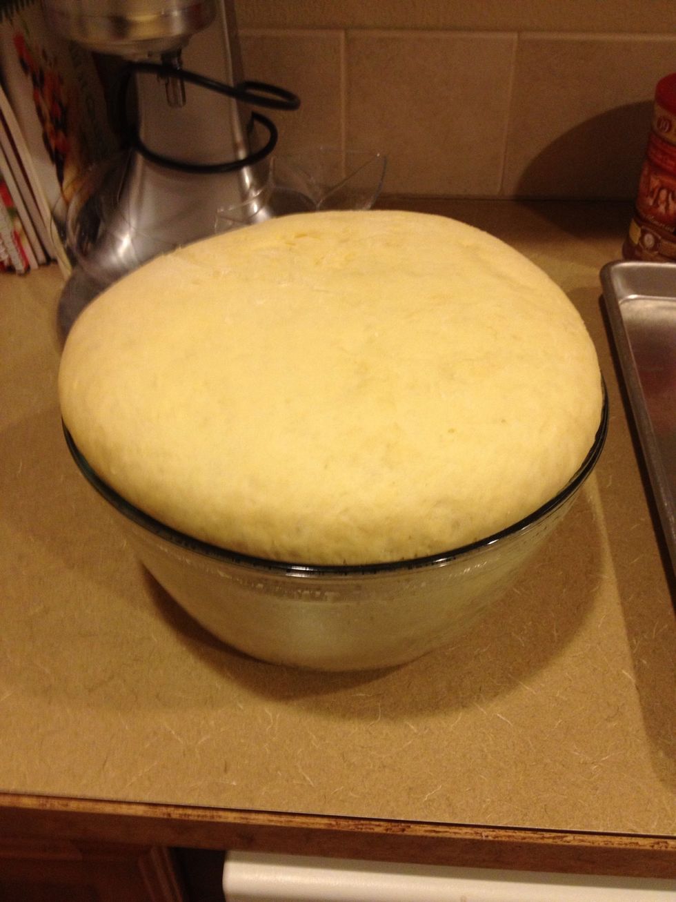 Add shortening, sugar, salt, and potato mixture to the yeast in the bowl and mix together