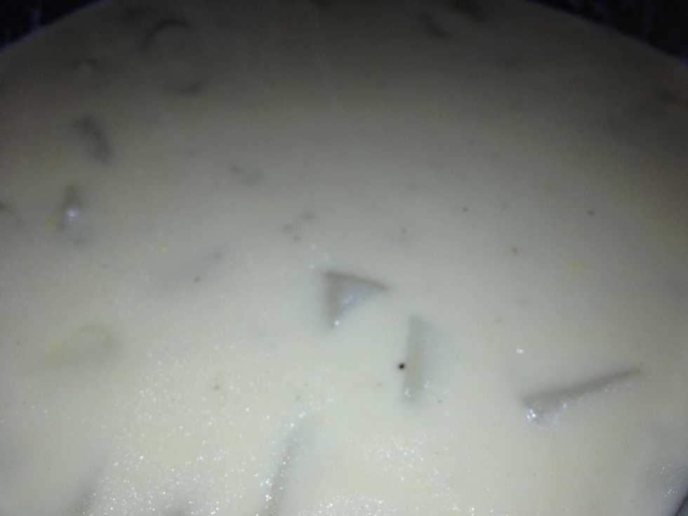 Add the cream, stirring CONTINUALLY until boiling. (if you stop stirring it will get lumpy and stick to bottom of pan).