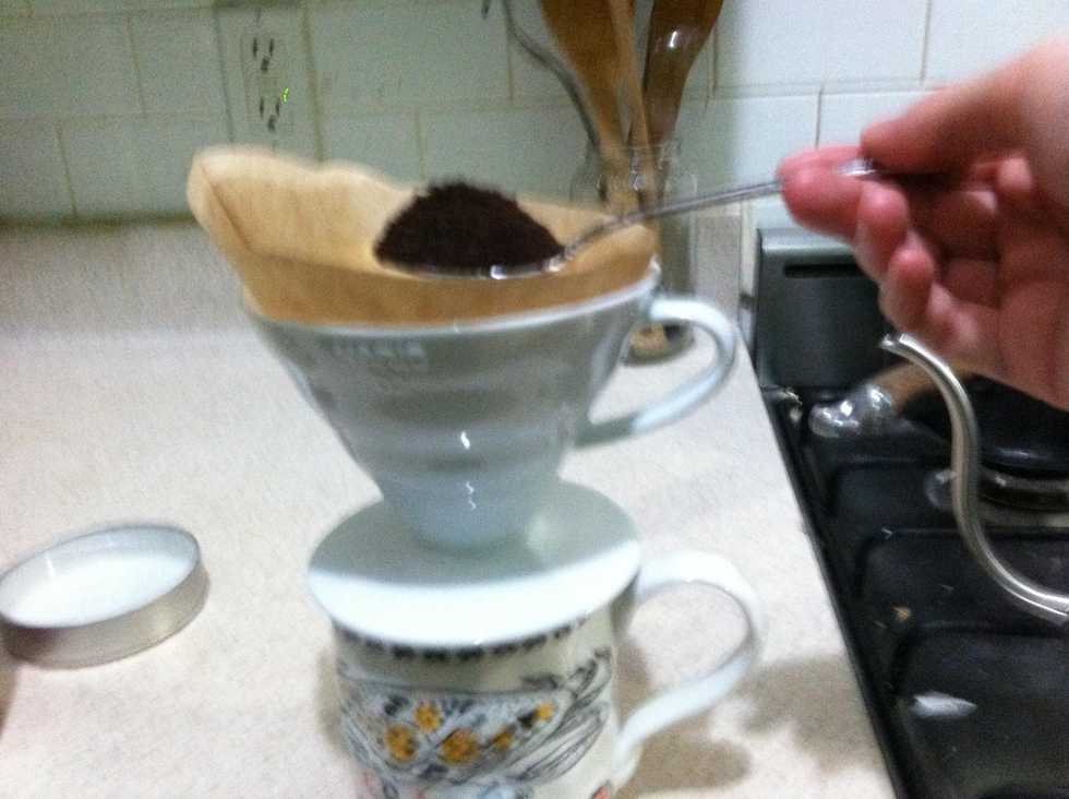 Measure two heaping tablespoons of medium-fine ground coffee into the filter.