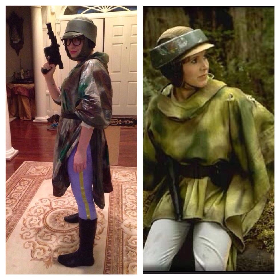Now that your poncho is done, pair it with your Leia pants, black boots, helmet and utility belt.