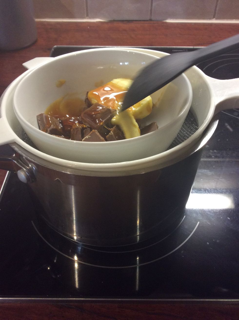 Now for the chocolate sauce. Add chocolate golden syrup and butter and put on top saucepan with boiling water in it until melted.