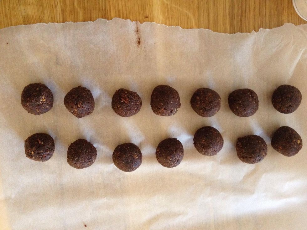 In a food processor put 10 dates, 10 prunes, 2 handfuls of lightly roasted hazelnuts, 2 tbsps ground almonds, 2 tbsps cocoa powder, 1 tsp coconut oil, 2 tsps cinnamon and about 2 tbsps of almond milk.