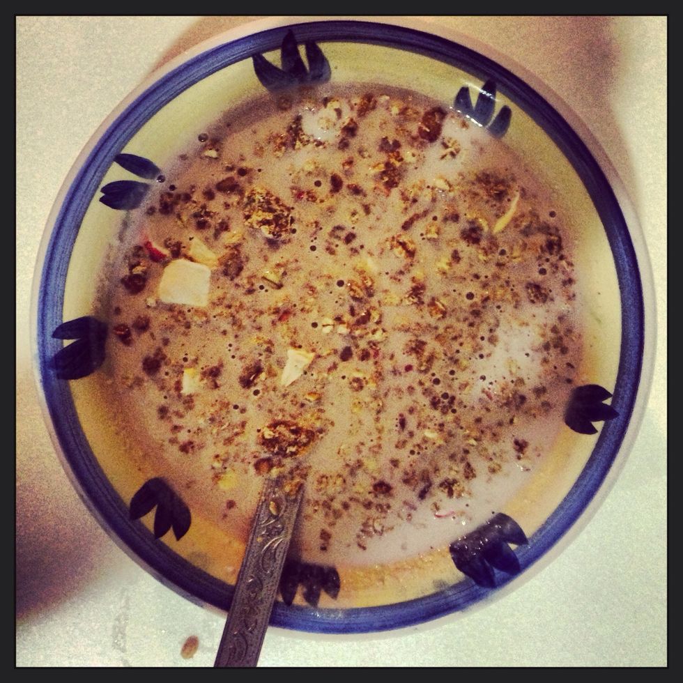 1 serving of Dymatize Elite Casein ( cinnamon bun flavoured.) Note: trust me, it's good.
