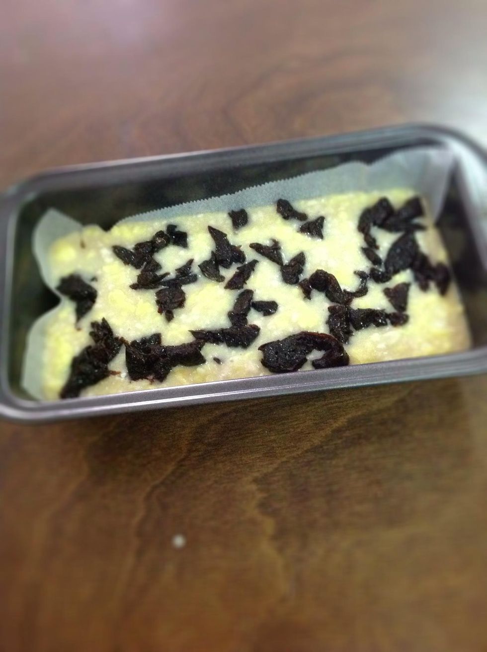 melt 1 stick of butter in a microwave less than 1 minute, add sugar, flour & milk in a bowl and pour it into your baking tray, sprinkle your chopped prunes