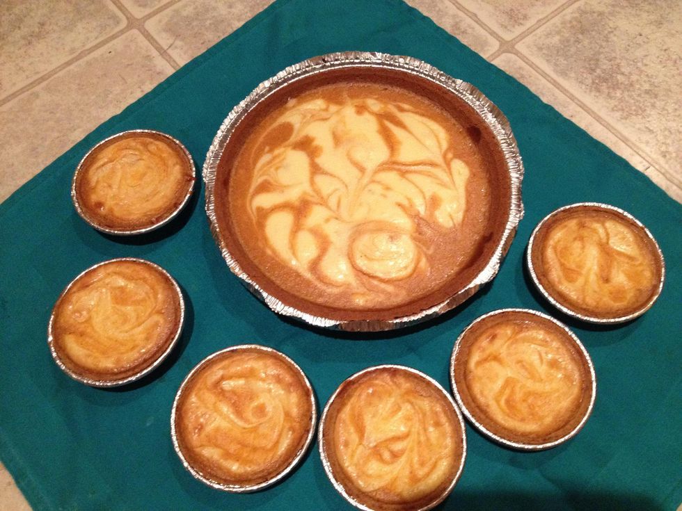 Dollop the remaining cheese cake mixture into each pie, leaving room on the sides to swirl. Remember dollop spoonfuls at a time because if you try to pour it in it will sink.