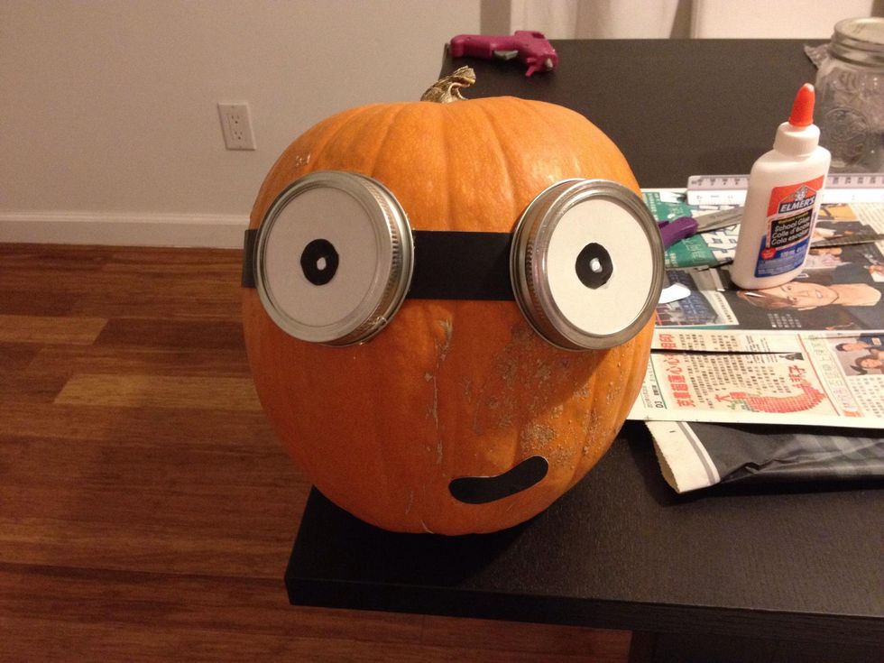 Finally, glue small white dots to minion's pupil and glue the smiling mouth to the pumpkin. Now you have a pumpkin minion. It only took around 20 minutes or so.