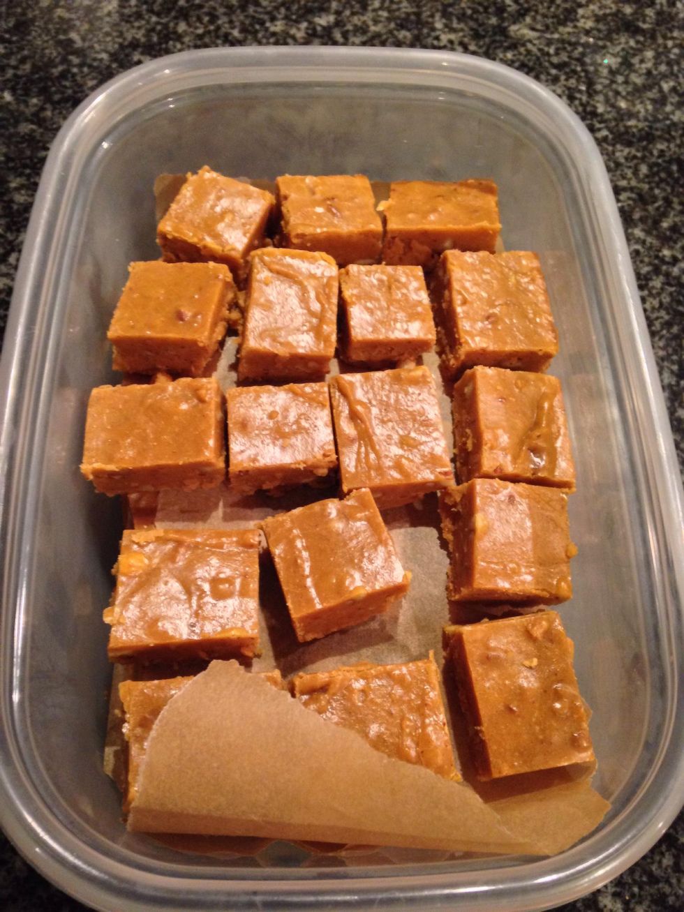 Using the foil, life fudge out of the pans. Discard foil. Cut into 1" cubes.