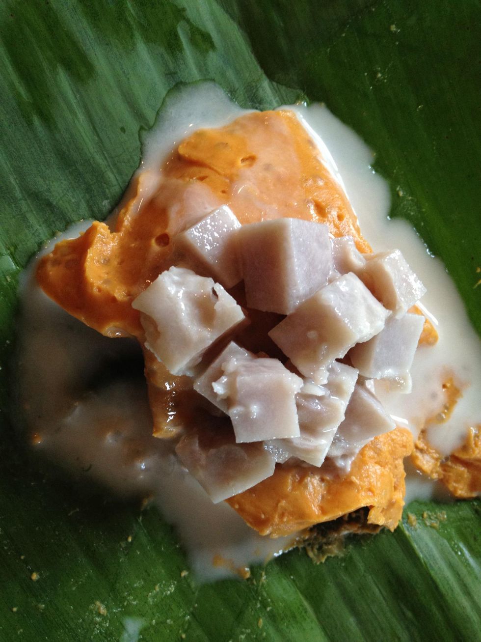 To make the sauce : Melt cane or palm sugar in boiling coconut milk and keep it chilled for serving.