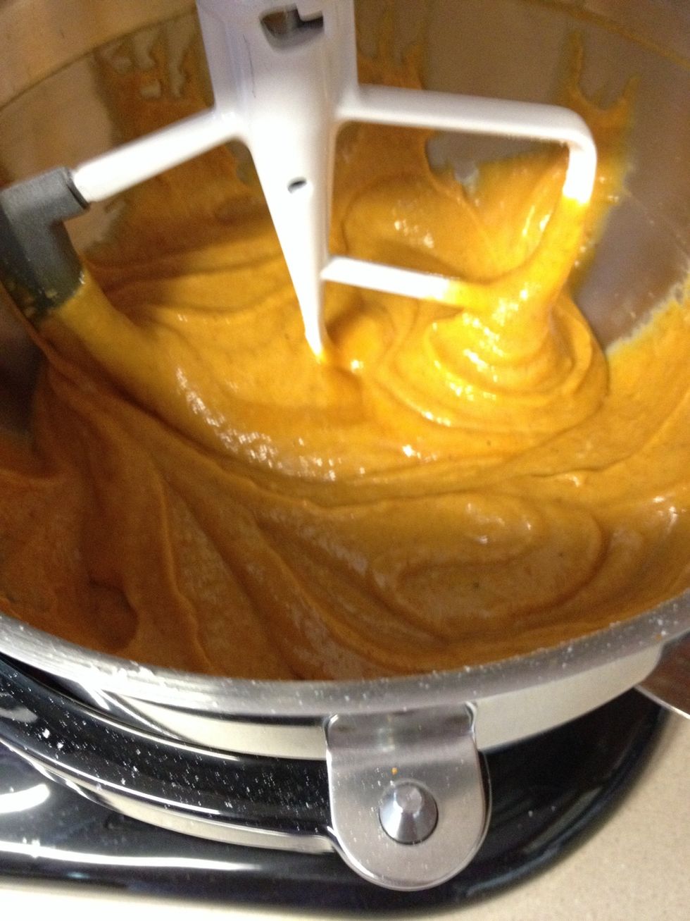 Place eggs, oil, and pumpkin in the mixer and mix until all combined