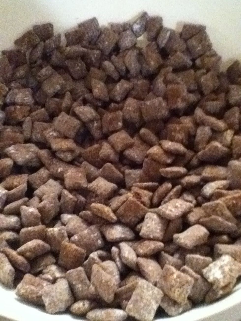 When the puppy chow is completely covered with powdered sugar pour it into a bowl and enjoy the sweet flavor!
