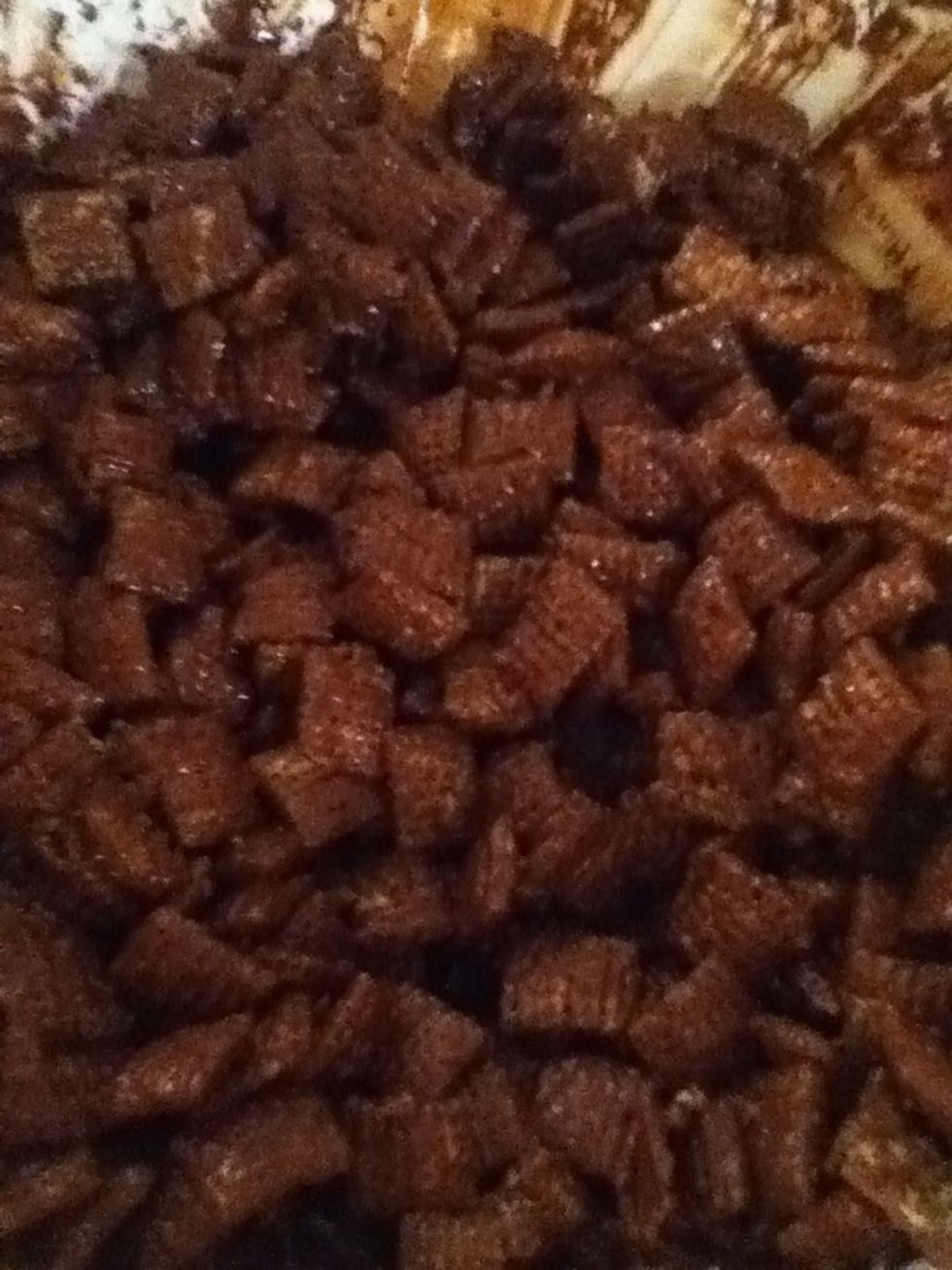 Pour the chex cereal into a grocery bag and gradually add the one and a half cups of powdered sugar. Shake the chex cereal with powdered sugar.