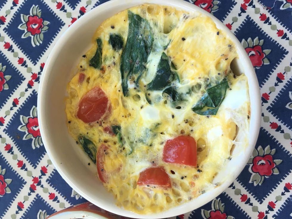 Fill mug with fresh spinach leaves, add a couple of tablespoons of water. Cover the mug with a paper towel and microwave for 1 minute. Drain the remaining liquid in the mug.