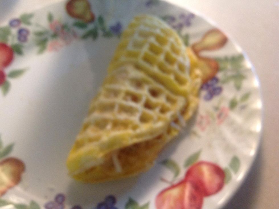 Gather the ingredients.Whisk the milk, and eggs togetherThen place in a heated waffle maker and wait about three minutes.Then carefully take outThen add the cheeseAnd done!