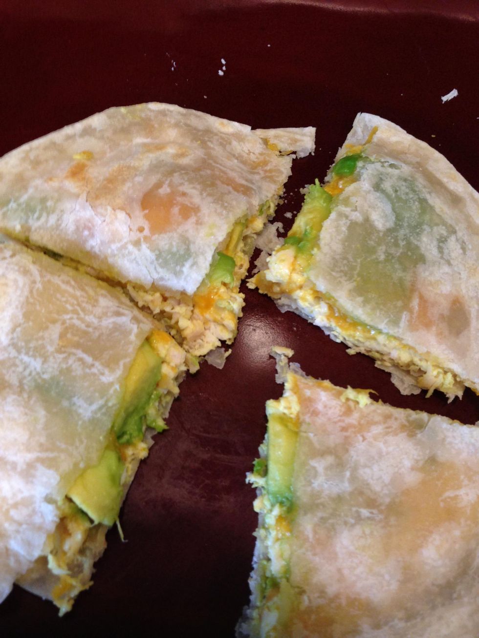 On the browned side of tortilla add the 1/4 C of cheese on top of the chicken, and add the avocado. Doesn't matter which order you put them on top.