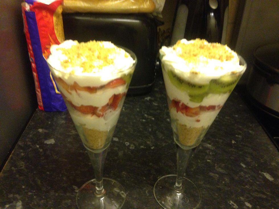 Gather your ingredientsCut your fruits into small piecesCrumble 5 biscuits.And layer it to your taste, I started with biscuit on the bottom. This is very quick and simple desert but very delicious.... Enjoy