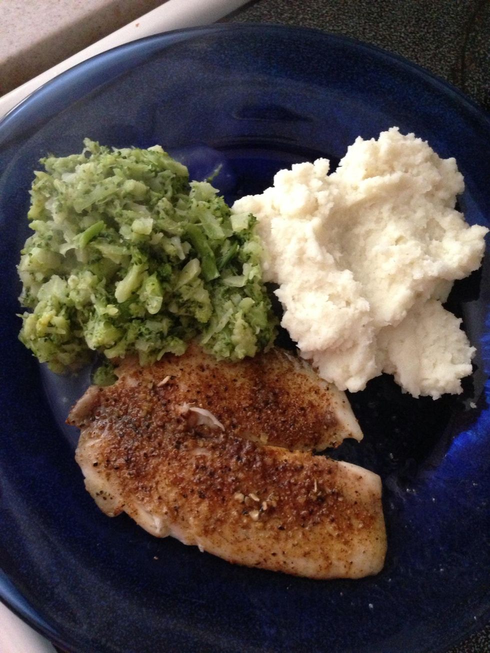 Add quick sides to your dish. I chose chopped broccoli and instant roasted-garlic flavored mash potatoes. 😋