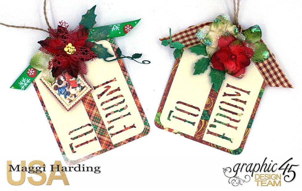 Now embellish your tags as you please. I used flowers, postage stamp cut-aparts, and diecut holly leaves to embellish my tags.