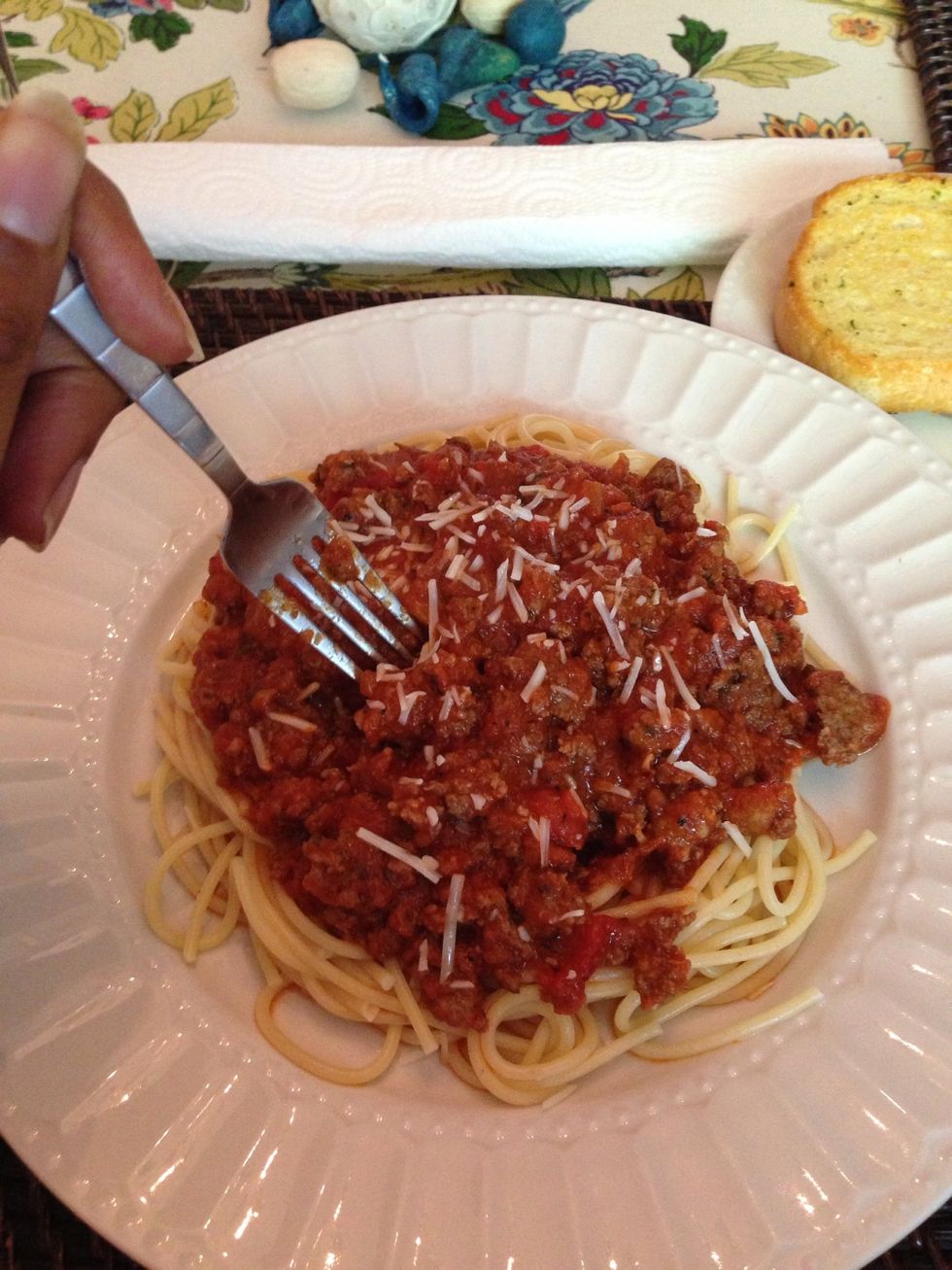 Add sauce to pasta with garlic bread and I added Parmesan cheese for decoration , with a glass of watermelon punch yumm