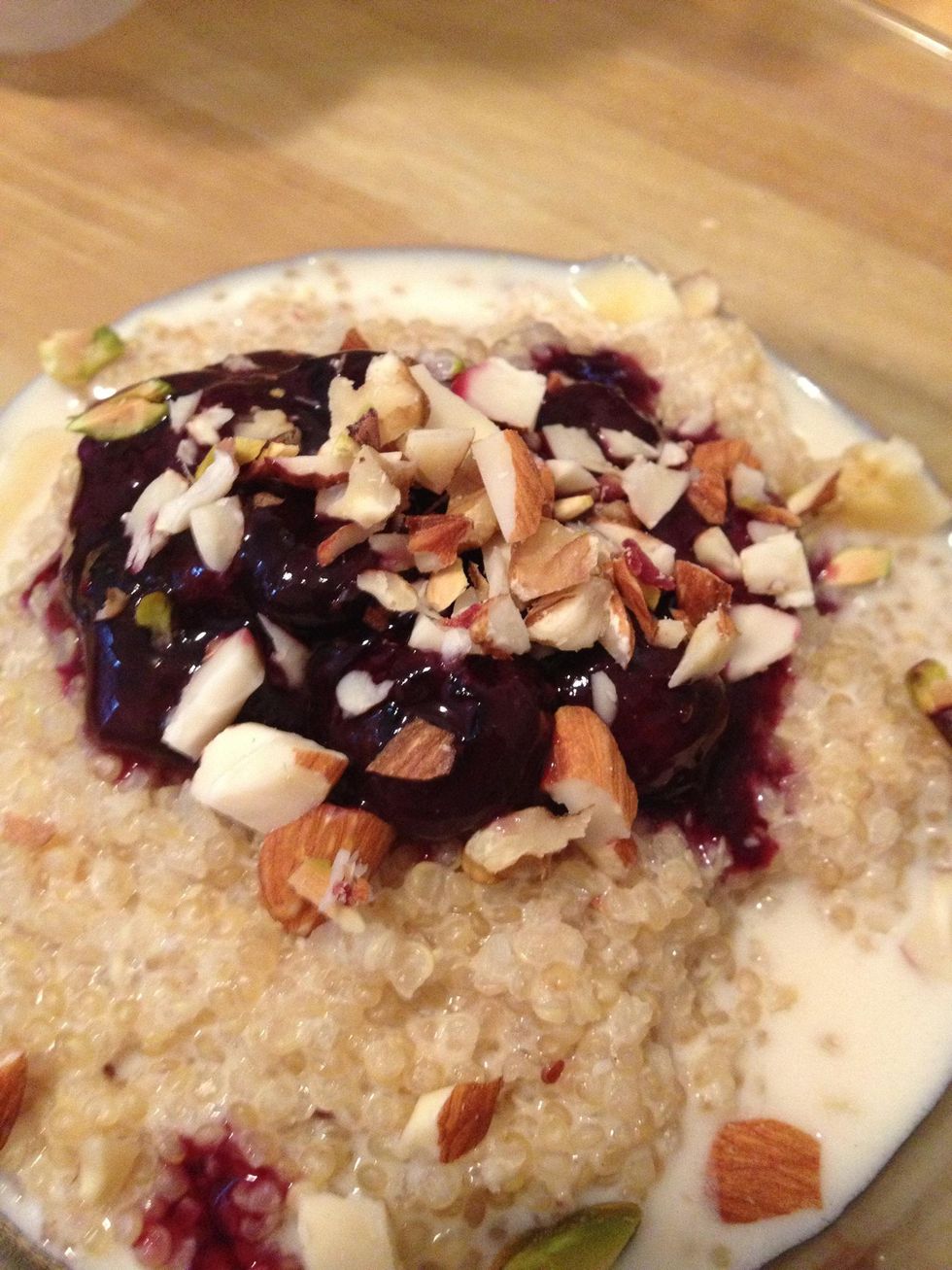 To assemble breakfast bowl: layer half of chopped banana, top with quinoa, followed by blueberry compote.