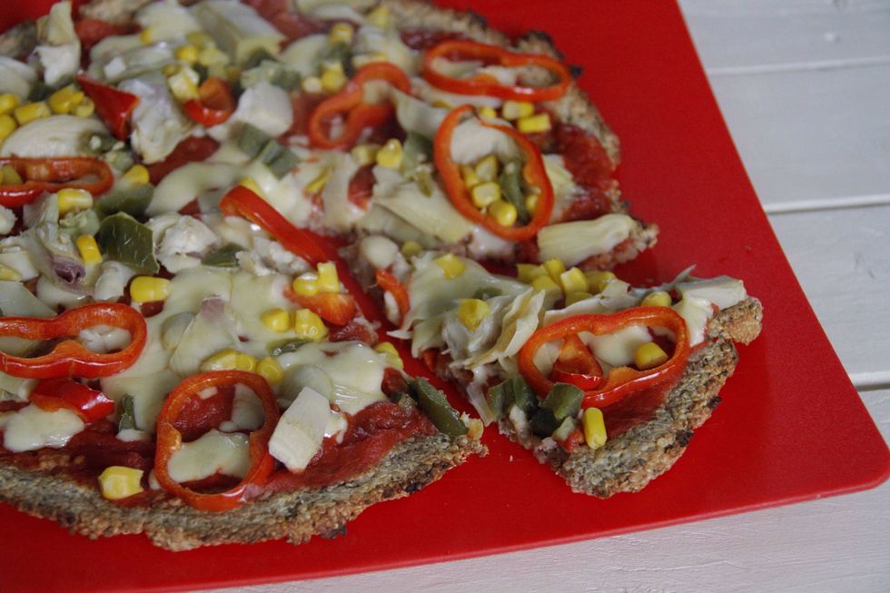 ...and toppings of choice. I used gouda cheese, red bell pepper, artichockes, corn and jalapeƱos. Season with oregano and bake for another 8-10 minutes.