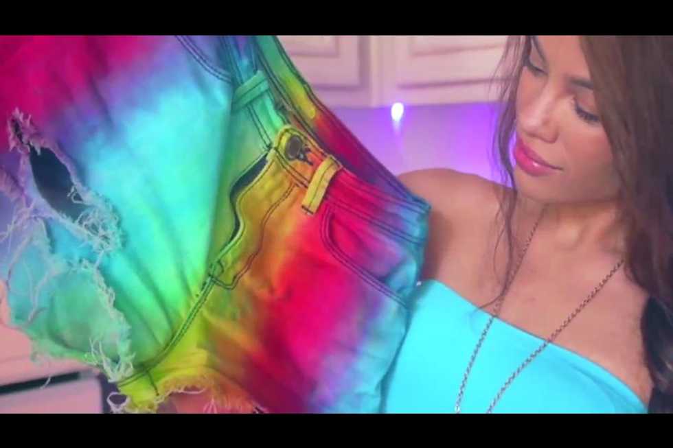 Start off by filling your spray bottle with bleach and spraying your shorts.
