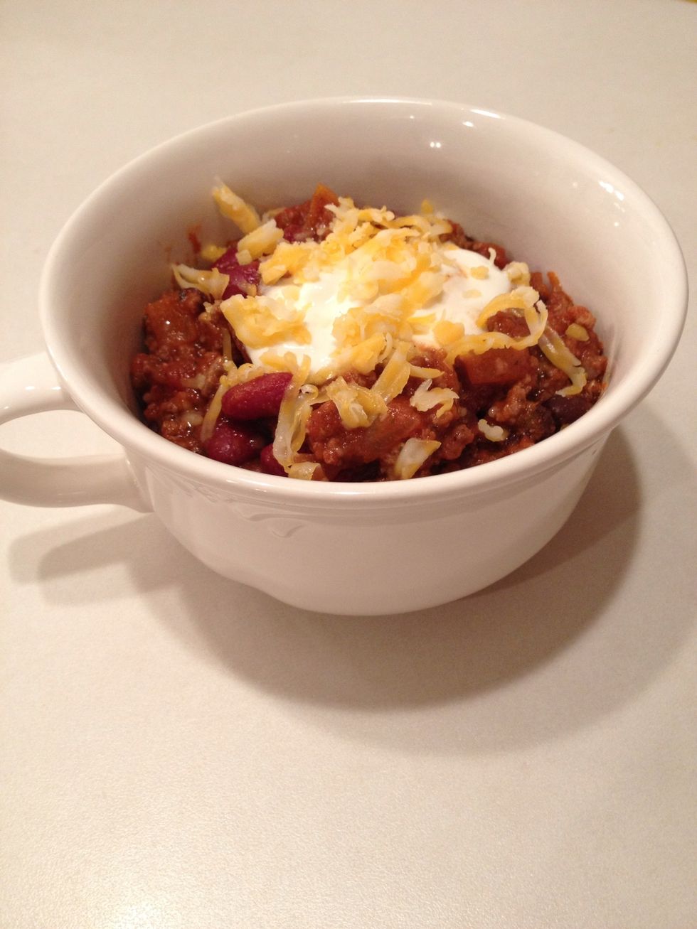 Top with sour cream and cheese. Serve and enjoy!