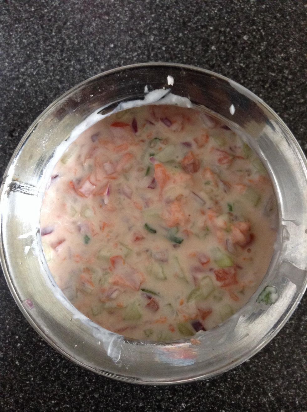 Mix all of these vegetables and add the yoghurt and salt (to taste). Mix well.