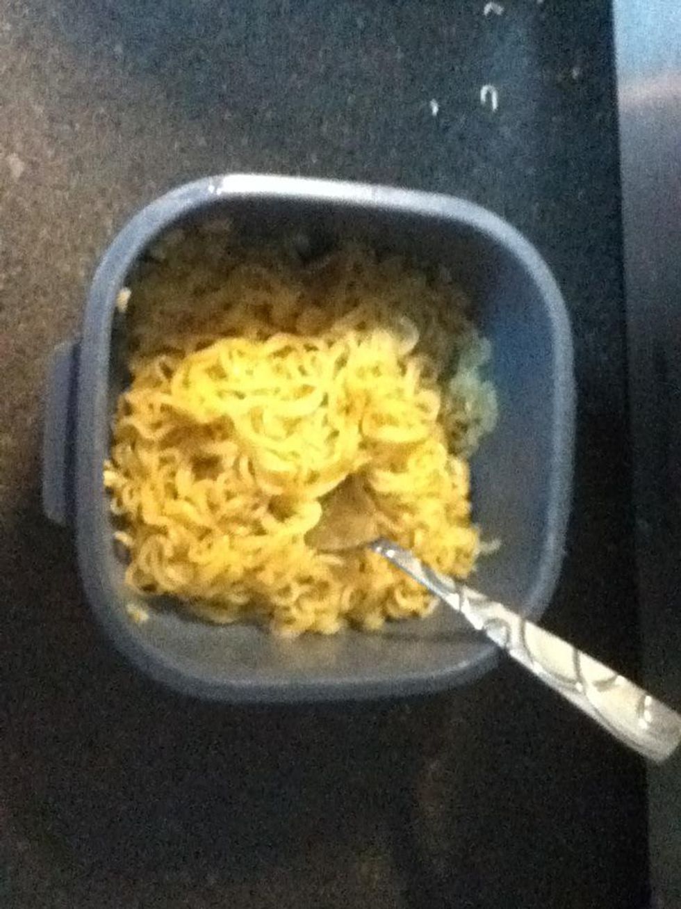 Drain the water from the noodles with a strainer or just use the fork like me.