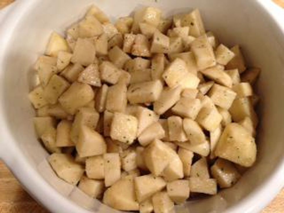 Get 2 lbs of potatoes. Skin and cut into 1 inch pieces. If you like the skins, just leave them on and cut into pieces.