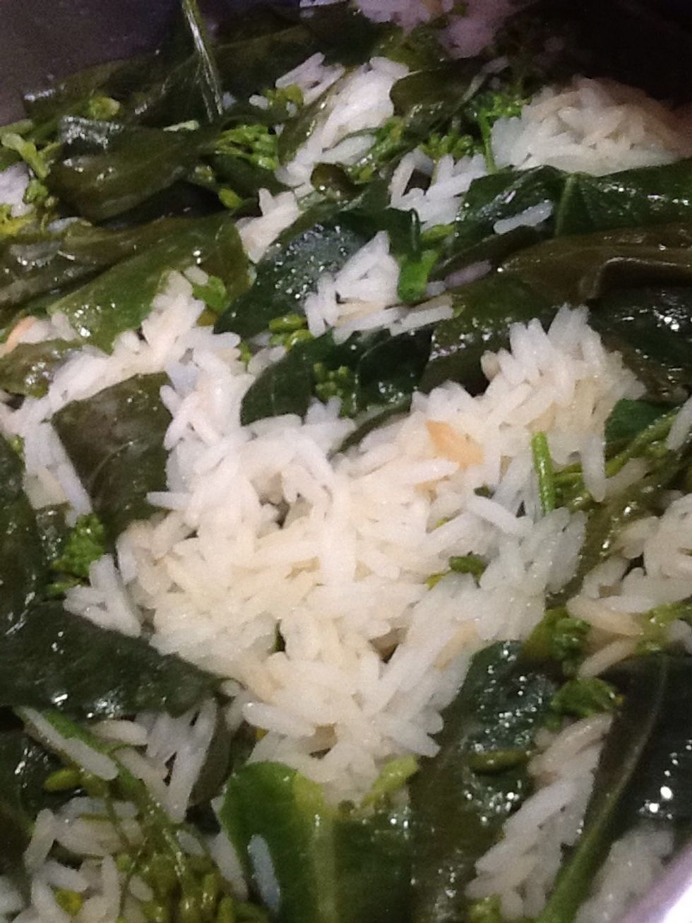 Add the olive oil and margarine to an pot once the mix of the two is hot add the row rice Fry on median heat but with a wood spoon mix it all in slow motion not let burn it soon is light brown