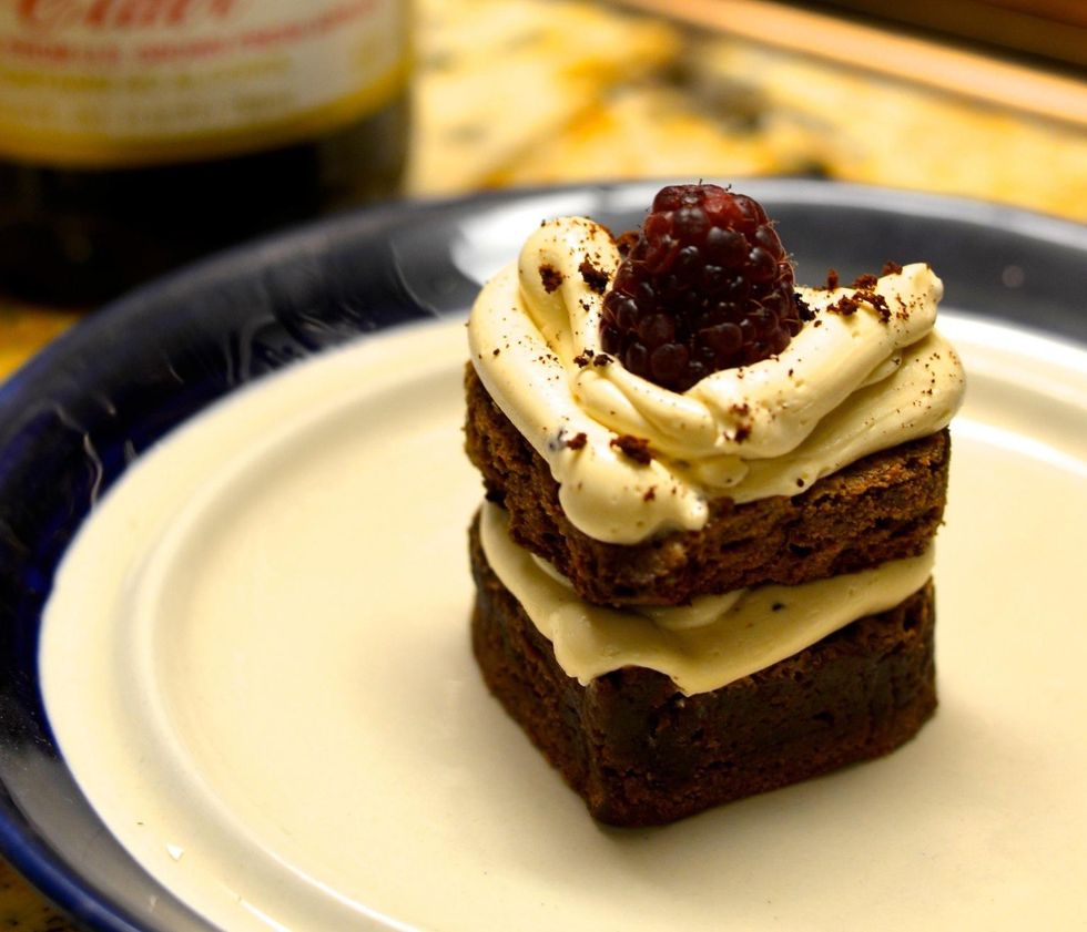 Put frosting into a piping bag, pipe, and stack brownie bites, then place a berry on top. I drizzled mine, with ground espresso granules, for a little creative touch!