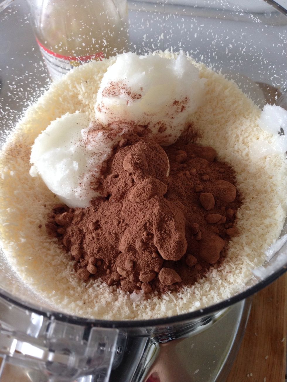 Add coconut oil, salt and raw cacao to the coconut in your food processor.