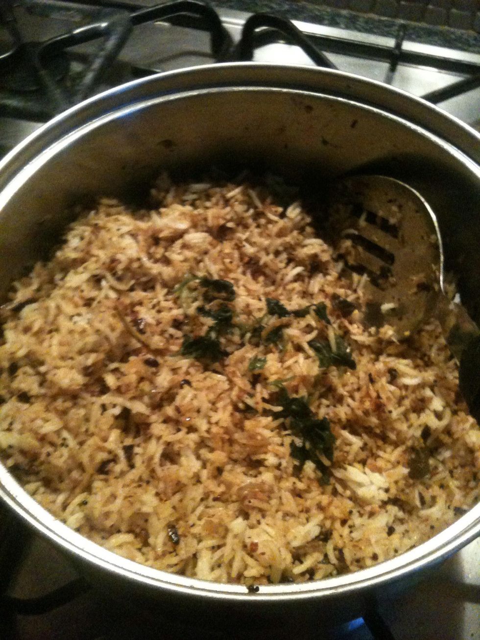 Now take the pan off the heat and add in the rice and salt. Mix well and garnish with chopped coriander!! Enjoy!