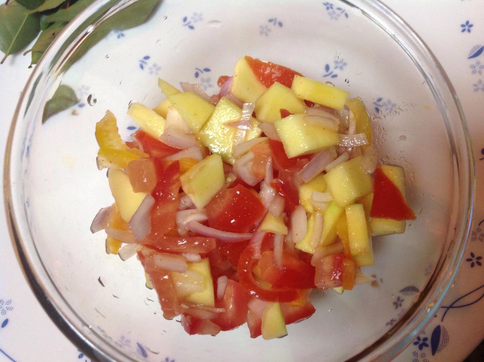 Ingredients for the salsa ready to be cut up into small pieces.Dice the raw mango, onion, tomato and capsicum into small sizes. Flavour with chilli powder, salt and lemon juice. Toss well and enjoy.