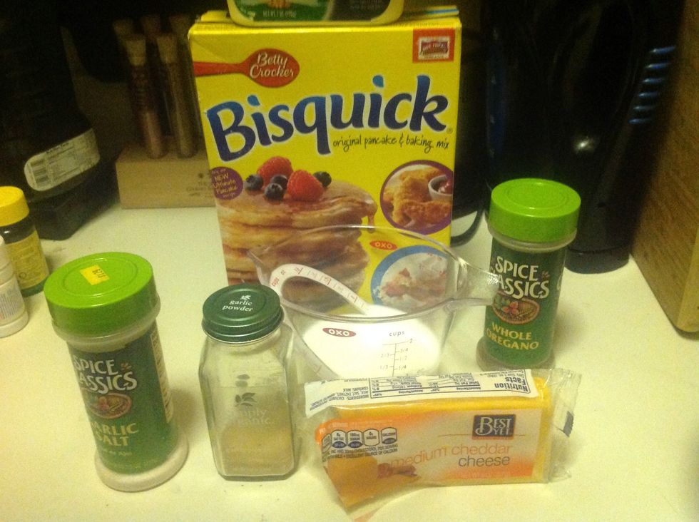 In large bowl, mix together biscuit mix, garlic powder and cheese.
