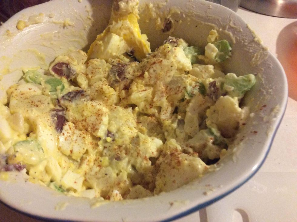 Mix the bowl gently until well blended. Finally add the egg slices and top with some paprika.... Enjoy your potato salad