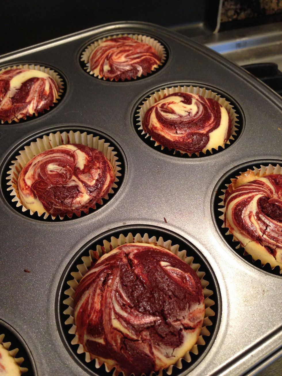 Put 1 spoon in the cupcake pan, then 1 spoon of cheesecake mix
