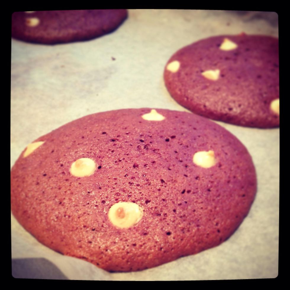 After mixing add the handful of chocolate chips and fold into mix with a wooden spoon. And scoop cookie onto tray with parchment paper on it and spread in a circular motion to shape the cookie