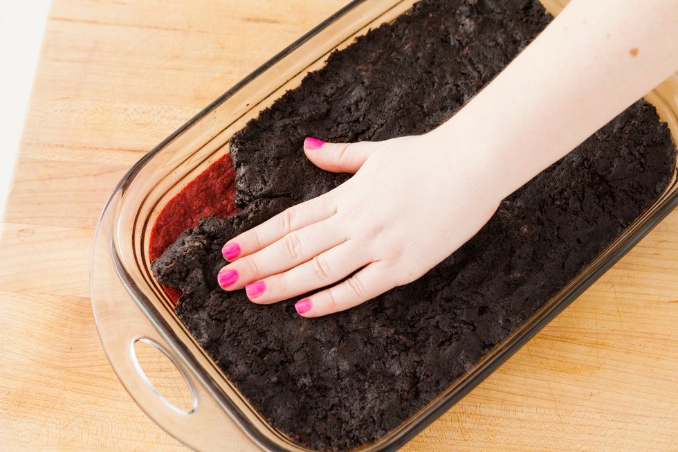 Melt your chocolate chips and pour over top Oreo truffle layer. To melt your chips, place in microwave for 30 seconds and stir. Repeat process until all chips are melted.