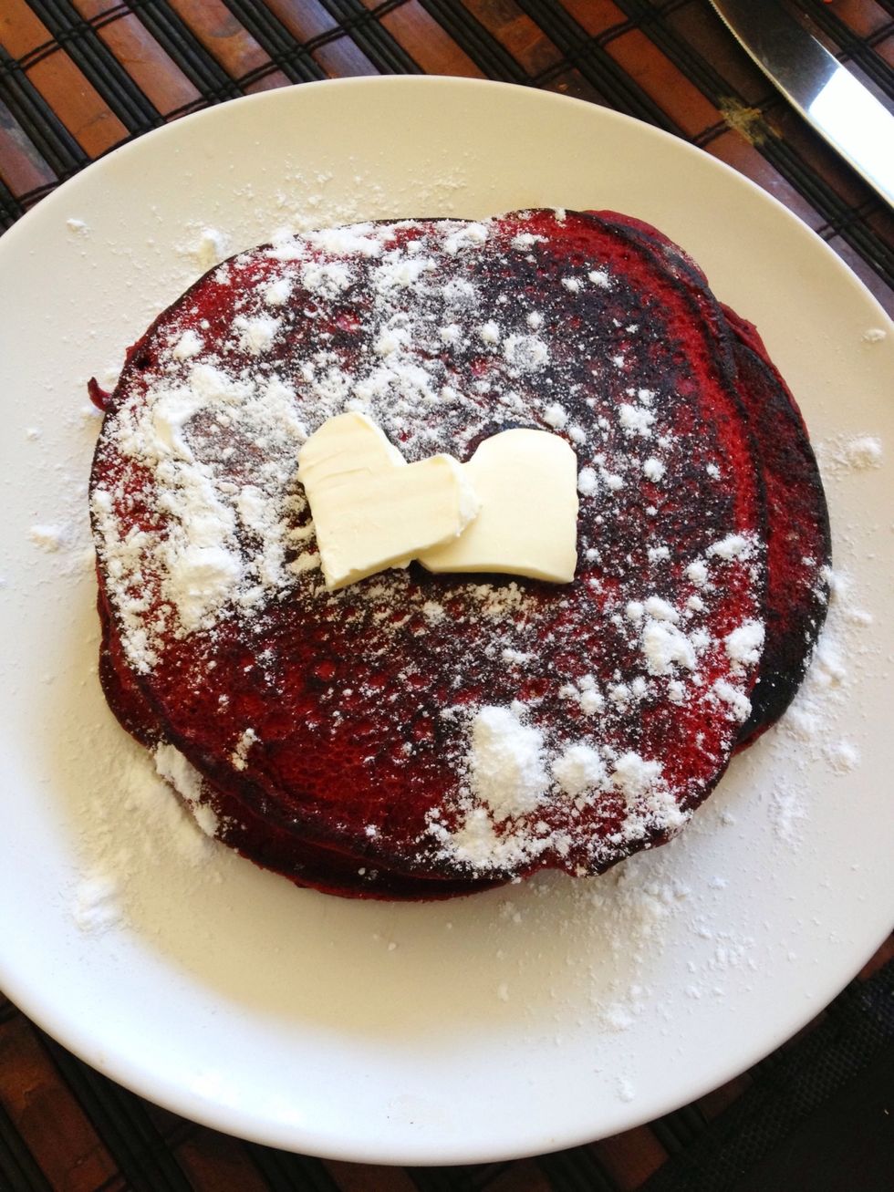 Stack your finished red velvet pancakes on a plate & sprinkle powdered sugar on top. Serve with syrup & your choice of breakfast drink (ie: coffee, mimosa, cranberry juice...etc)