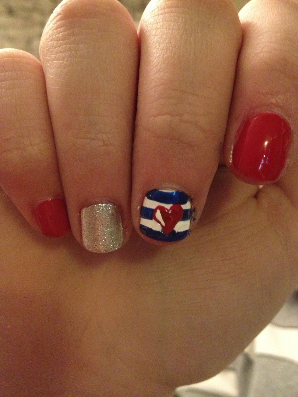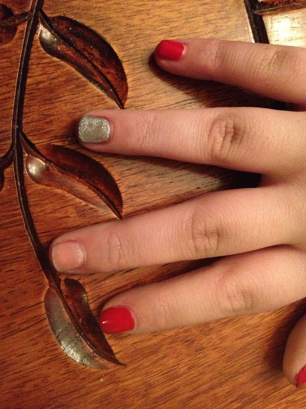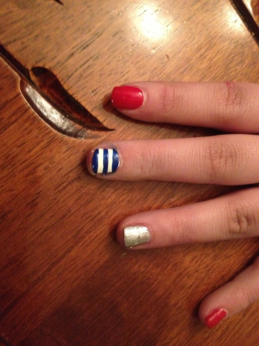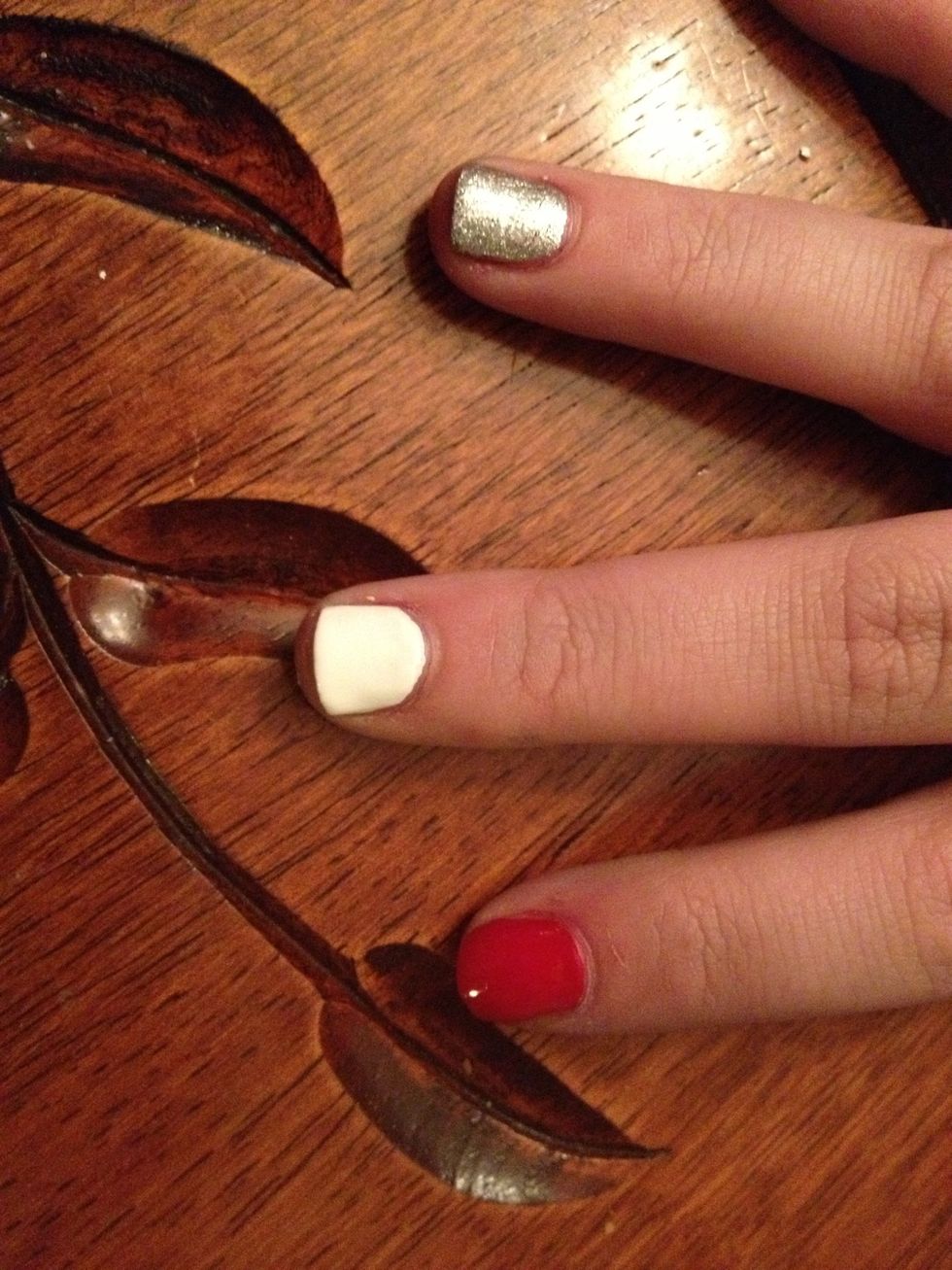 Then paint the fourth finger in silver or any other glitter that looks good with blue and red