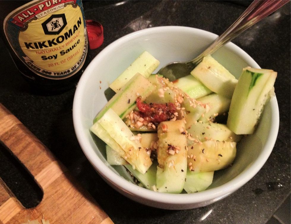 Wash the cucumber. I used a large one. You can also use 2 or 3 Persian cucumbers or Kirby cucumbers. Peel the skin off and remove seeds inside. Cut the cucumber into strips.