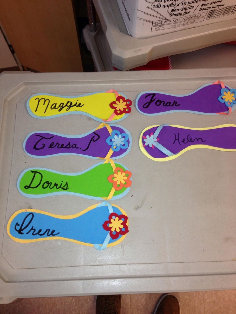 Then glue 2 strap like pieces of paper to the sides and middle of flip flop but leave the straps "open" so that it gives the flip flop effect.