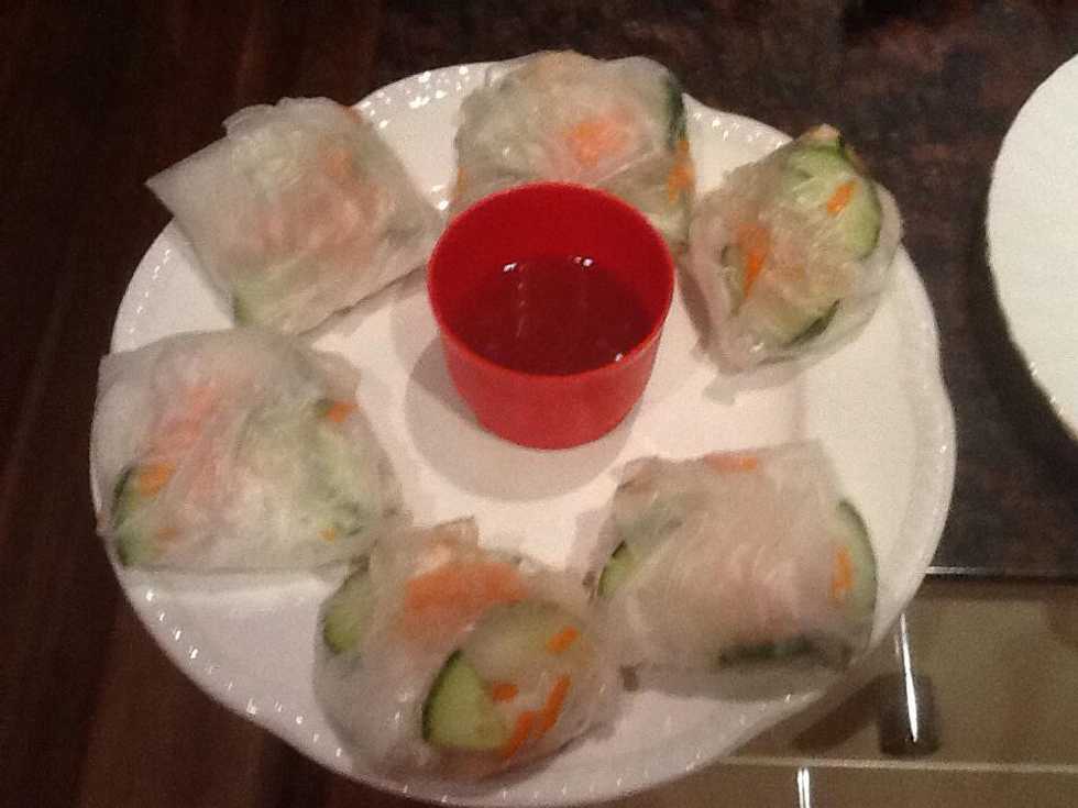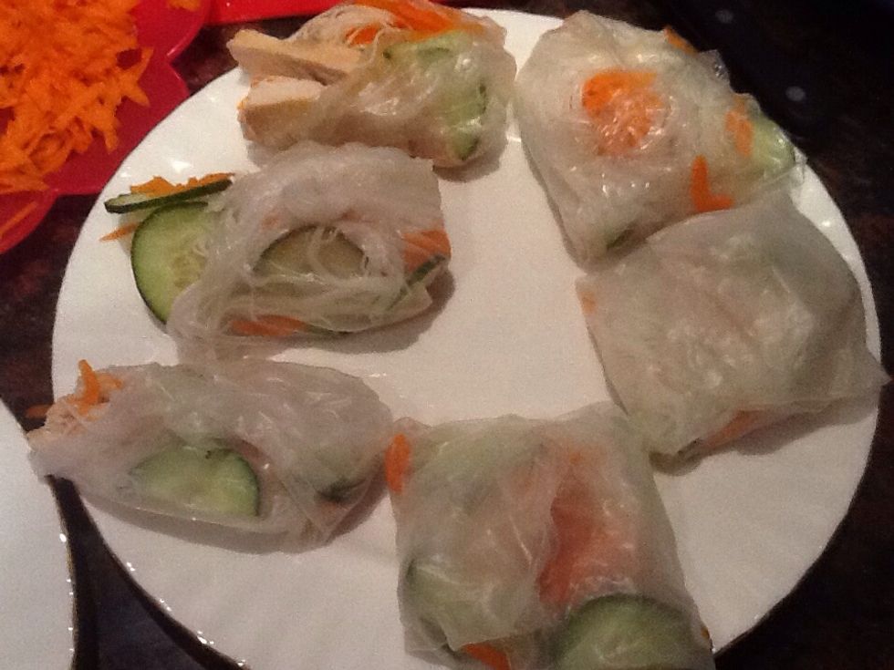 Spread a proportion of each ingredients on the one end of rice paper. Fold the bottom edge over the fillings , then fold both sides and roll away