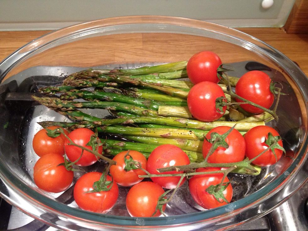 Start by placing your asparagus in an ovenproof dish. Drizzle with a little oil and season. Put a small splash of water in the bottom of the dish. Roast at 180 C for about 10 mins
