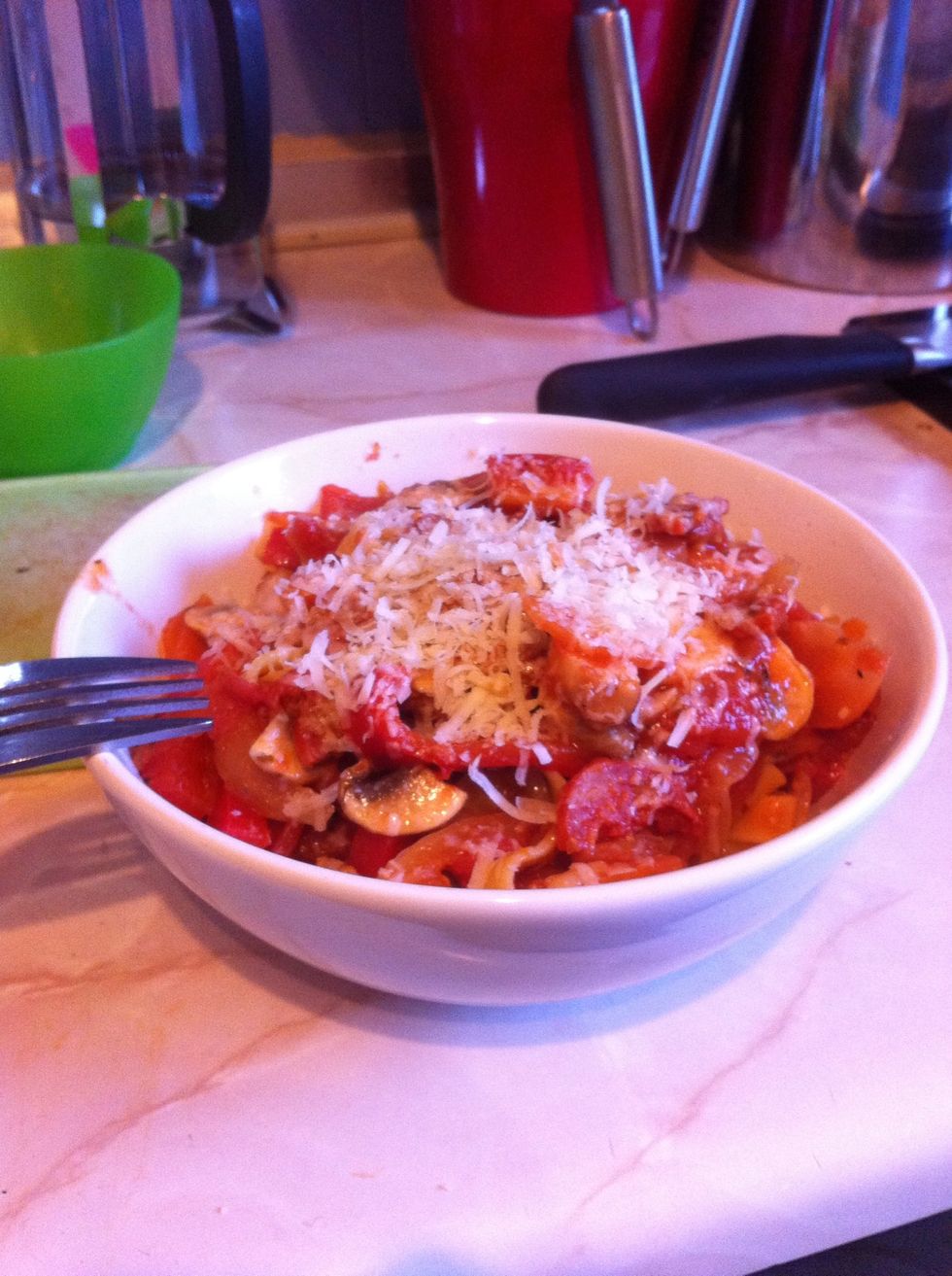 Once the pasta is done, the sauce will be thick and heavy. Drain the pasta and chuck it in. Mix it around...