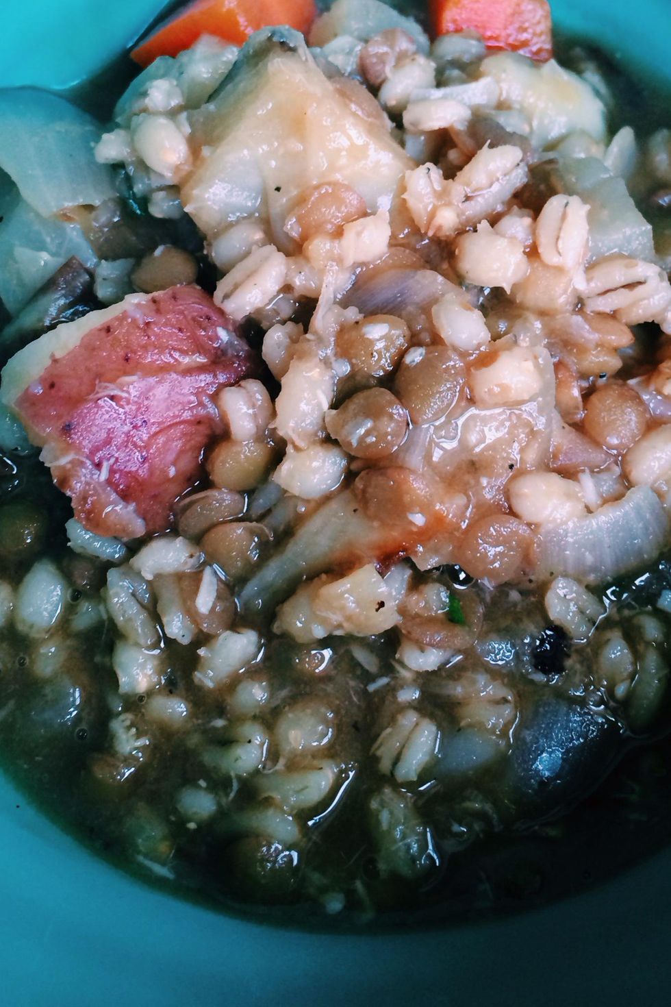 Mash the garlic and add to your stock pot. Stir into the broth and barley. (Which should now be cooked.)