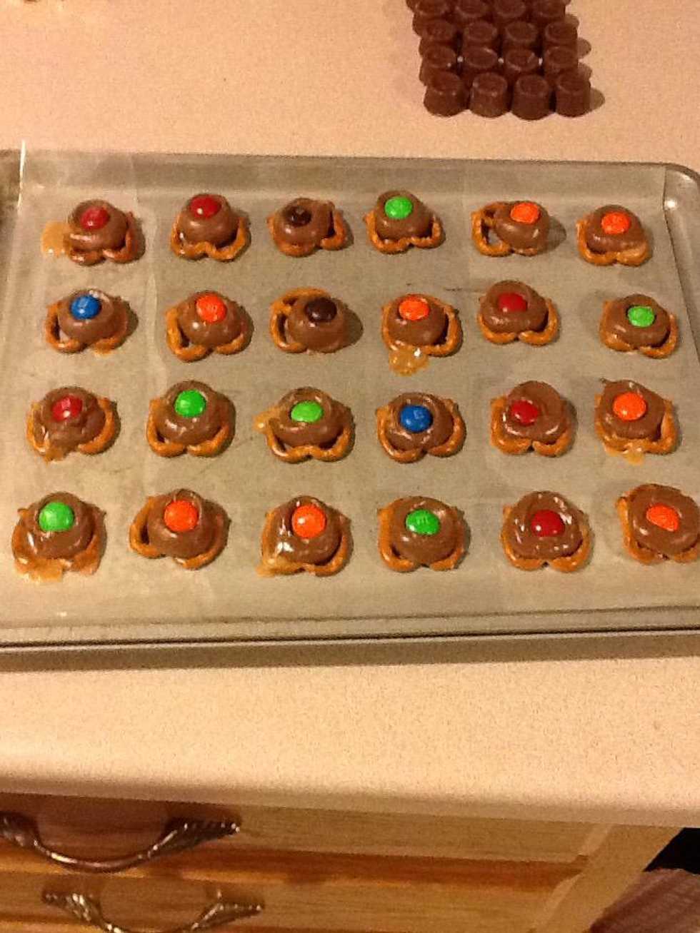 Take them out of the oven and put your M&Ms on the Rolos before they cool.