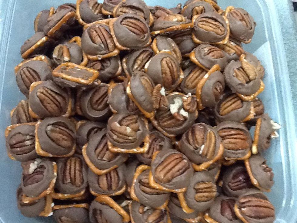 1) Remove pan from oven. 2) Place a pecan halve on top of each pretzel. 3) Push pecan down. Work quickly, before the Rolo candy cools.