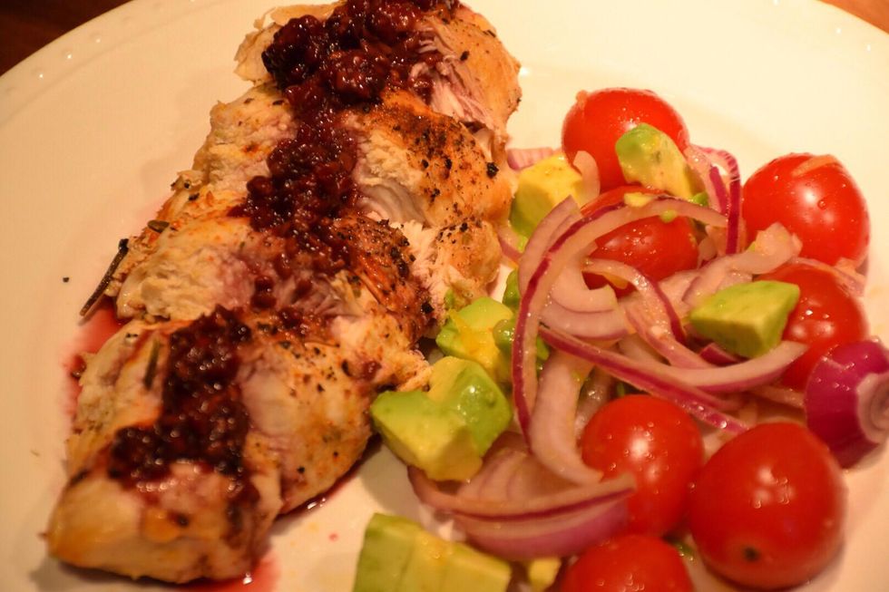 Cut the chicken on the bias and drizzle blackberry coulis. Serve with tomato onion avocado salad in a zesty lemon viniagrette. Enjoy!